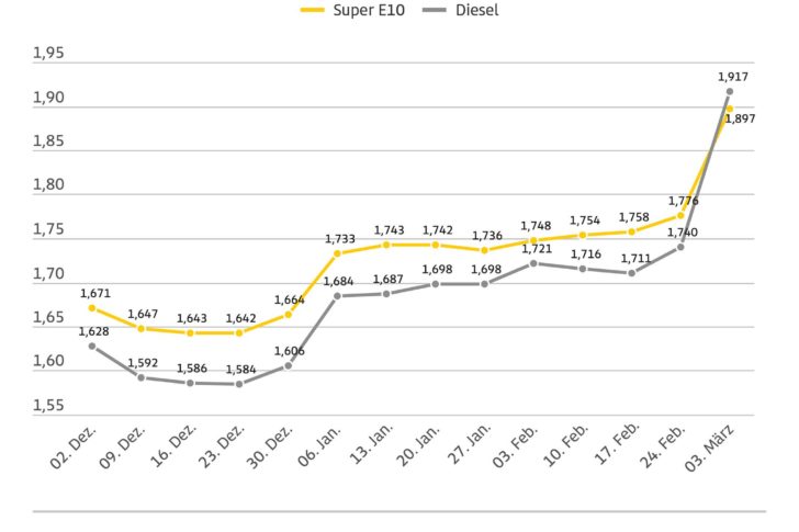 Kraftstoffpreise springen stark nach oben – Diesel im Wochenvergleich fast 18 Cent teurer, Benzinpreis steigt um gut zwölf Cent