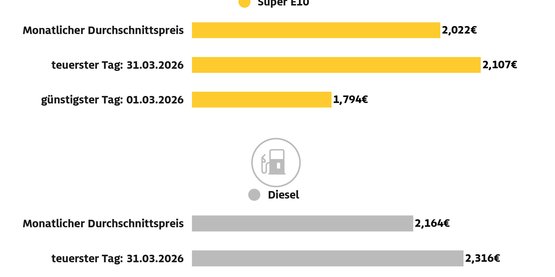 München (ots) – Die Kraftstoffpreise sind im März 2026 massiv gestiegen. Wie die aktuelle ADAC Auswertung der Kraftstoffpreise in Deutschland zeigt, kostete ein Liter Diesel im Monatsmittel 2,164 Euro – nie zuvor war Diesel im Monatsschnitt teurer! Teuerster Diesel-Monat aller Zeiten war bisher der März 2022, kurz nach Beginn des Ukraine-Kriegs, mit durchschnittlich 2,140 Euro. Auch Super E10 hat sich zuletzt sehr stark verteuert und kostete im März im Schnitt 2,022 Euro. Damit blieb der Preis zwar noch um 4,7 Cent unter dem des Rekordmonats März 2022, als für einen Liter Super E10 im Schnitt 2,069 zu bezahlen waren. Allerdings war der März damit für Super E10 der drittteuerste Monat aller Zeiten.