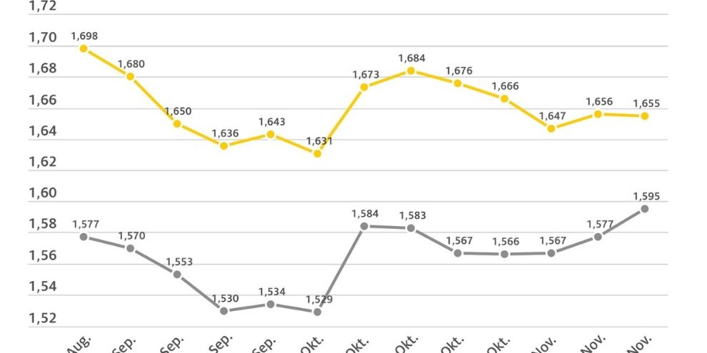 Der Preis für Super E10 sank hingegen minimal und liegt derzeit mit einem Durchschnitt von 1,655 Euro um 0,1 Cent unter dem Wert der Vorwoche. Damit hat sich der Dieselpreis bis auf sechs Cent dem Preis von Super E10 angenähert. Der steuerliche Unterschied zwischen beiden Kraftstoffsorten beträgt jedoch rund 20 Cent.