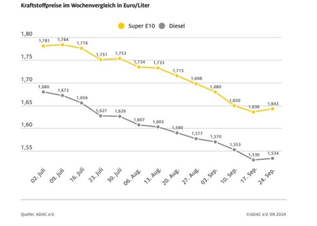 München (ots)So günstig wie im September 2024 konnten die Autofahrerinnen und Autofahrer seit Ende 2021 nicht mehr tanken. Wie der ADAC in seiner monatlichen Auswertung der Kraftstoffpreise ermittelt hat, kostete ein Liter Super E10 im Monatsmittel 1,650 Euro. Noch günstiger war Benzin letztmals im Dezember 2021 mit einem Durchschnittspreis von 1,605 Euro. Auch bei Diesel-Kraftstoff verlief…