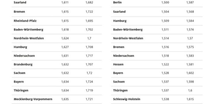 Diesel ist in Rheinland-Pfalz am preiswertesten. Durchschnittlich kostet ein Liter hier 1,499 Euro, dicht gefolgt von Berlin mit 1,500 Euro, das damit auch bei Diesel zu den günstigsten Bundesländern gehört. Am tiefsten in die Tasche greifen müssen die Autofahrerinnen und Autofahrer dagegen in Mecklenburg-Vorpommern, wo ein Liter 1,565 Euro kostet. Im Vergleich zum billigsten Bundesland Rheinland-Pfalz ist dies ein Aufschlag von 6,6 Cent.