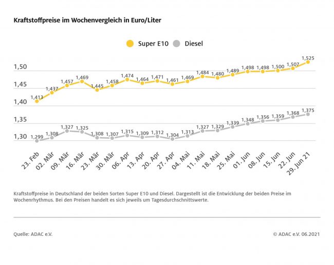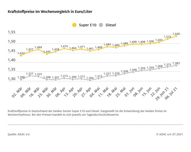 Spritpreise: Tendenz steigend Benzinpreis bei 1,540 Euro je Liter, Diesel kostet 1,383 Euro