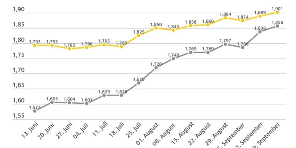 Der Anstieg der Kraftstoffpreise geht auch in dieser Woche weiter. Vor allem Diesel verteuerte sich gegenüber der Vorwoche erneut in stärkerem Maße als Benzin. Dies zeigt die aktuelle ADAC Auswertung. Danach kostet ein Liter des Selbstzünderkraftstoffs im bundesweiten Mittel 1,856 Euro (plus 1,8 Cent). Der Preis für einen Liter Super E10 liegt aktuell im Schnitt bei 1,901 Euro (plus 1,2 Cent).